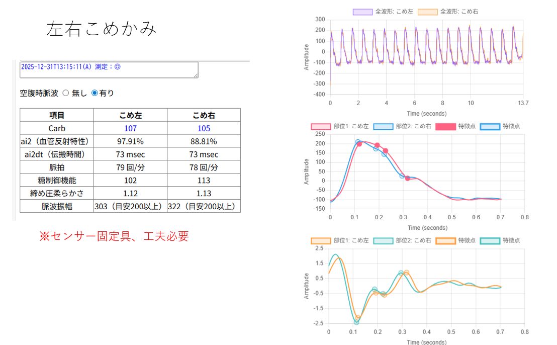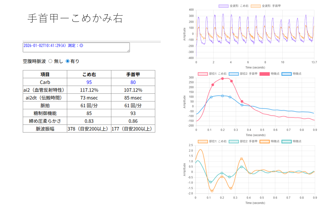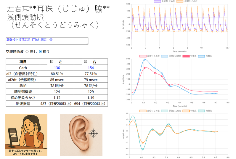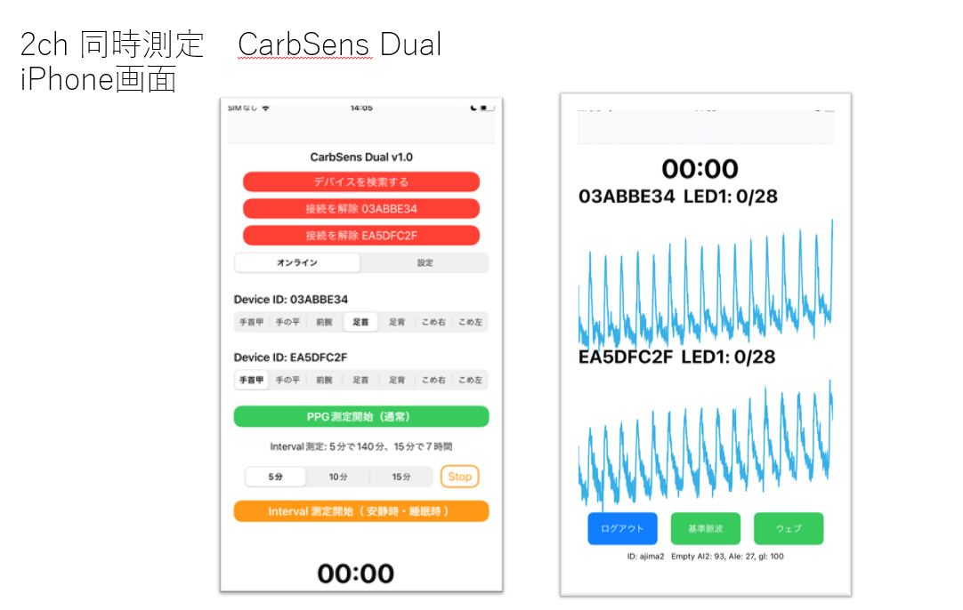 CarbSens Dual は、2点同時の脈波(PPG)計測と差分解析により、